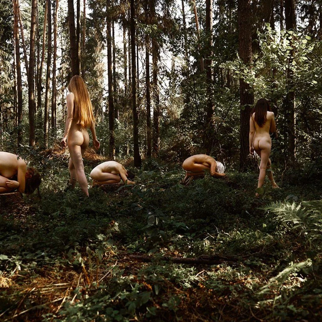 Голые мужчины и женщины в лесу