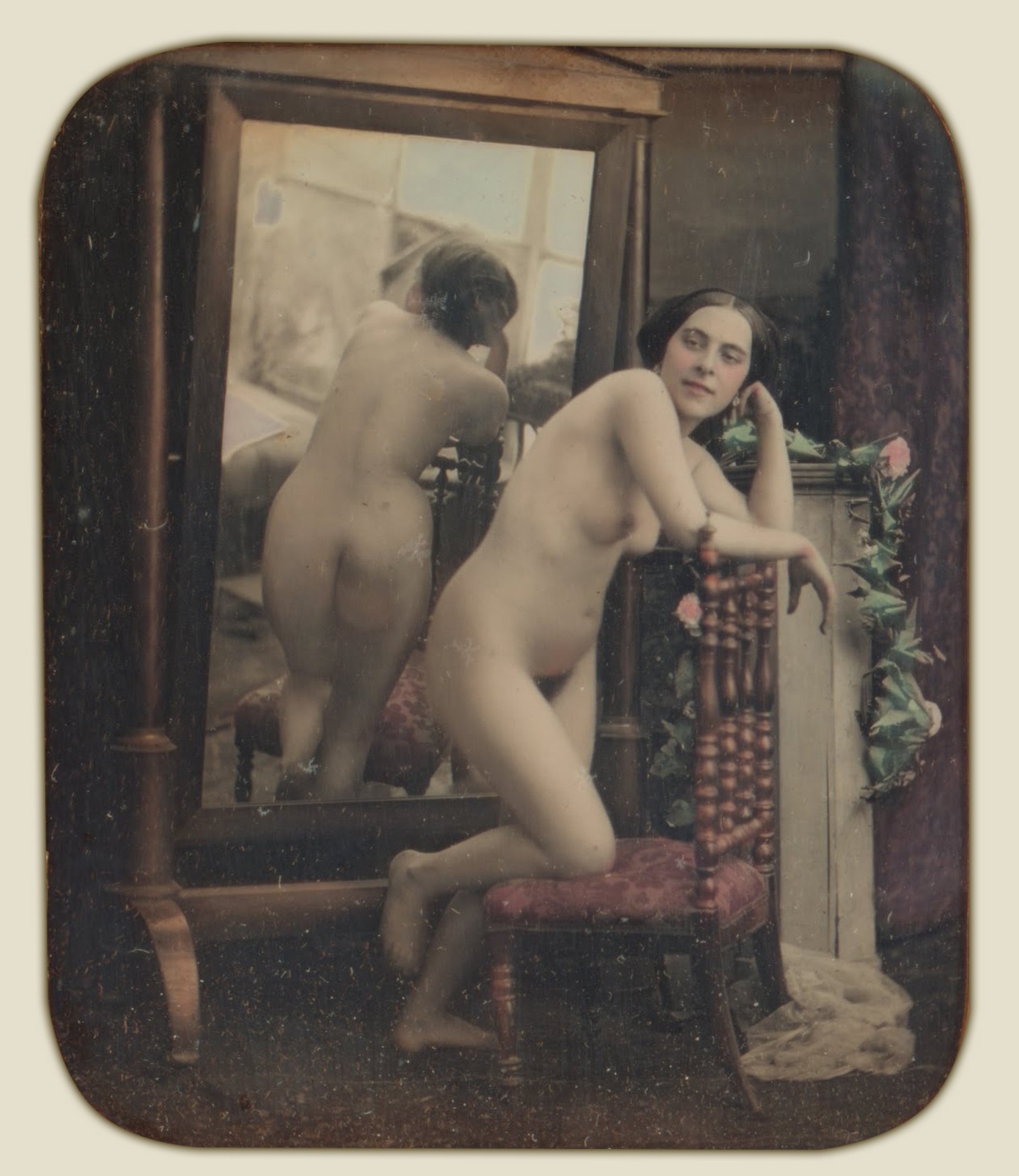 Naked women in front of a retro mirror