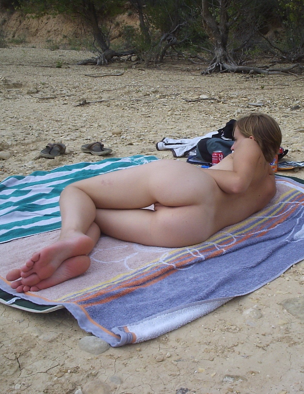 Nudist sunbathes on her stomach